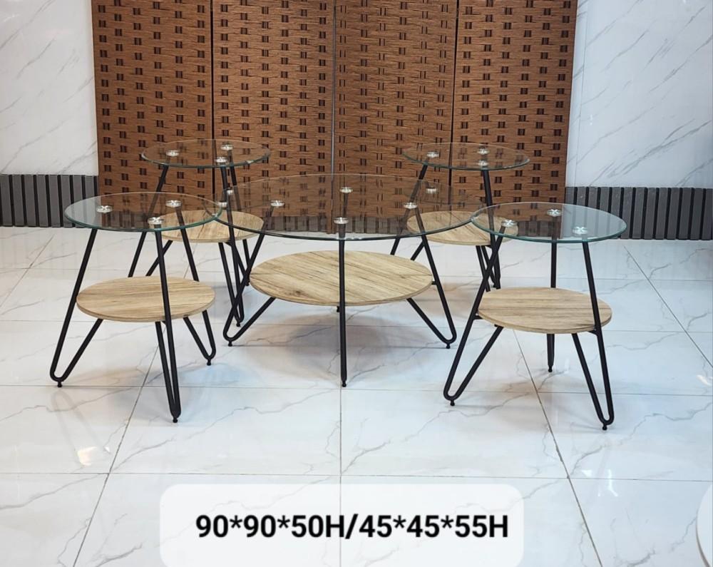طقم طاولات 5 قطع دورين رف خشبي سطح زجاج شفاف