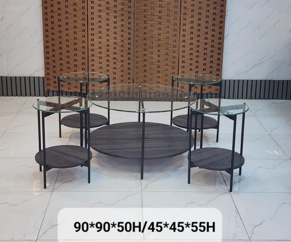 طقم طاولات 5 قطع دورين رف خشبي سطح زجاج شفاف